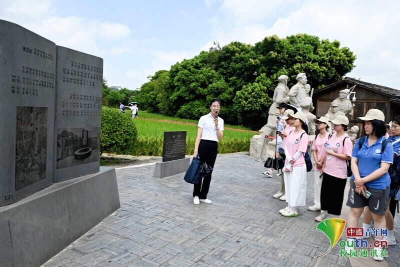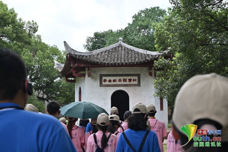图为实践团成员寻访红军烈士纪念亭。